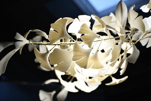Як результат пошуків - серія оригінальних світлових інсталяцій. Кожна робота на металевому каркасі складається з напівпрозорих порцелянових пелюсток, розміщених таким чином, щоб відображати і розсіювати світло. Існує п'ять різновидів листя гінкго, що відрізняються один від одного за розміром та дещо відмінні за формою. Для люстри кожен листок виготовляється з кістяної порцеляни, яка характеризується надзвичайної крихкістю та непіддатливістю до маніпуляцій. Виготовлення конструкції люстри, що складається з 100 листків – це справа кількох тижнів. За словами дизайнерки, створення більш великої роботи може зайняти близько трьох-чотирьох місяців. Однак результат неодмінно вразить!