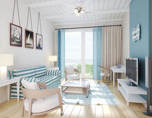 1. Використання природних кольорів. Бажану атмосферу найкраще можна передати саме через візуальні ефекти. Доречними кольорами для стін, підлоги, текстилю, меблів й будь-яких інших предметів інтер’єру вважаються відтінки моря (синій, бірюзовий, лавандовий), теракотові, оливкові, червоні, рожеві кольори, а також палітра сонячного жовтого.