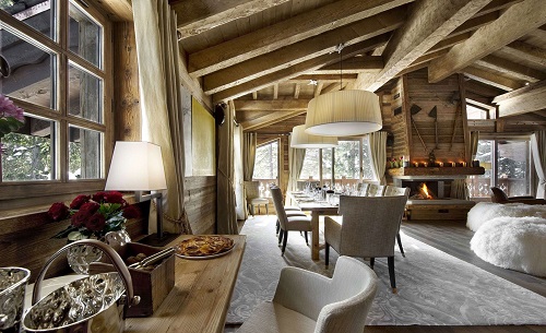 Интерьер шале выглядит как охотничий дом. Об этом могут свидетельствовать даже мельчайшие детали украшения: рога на стене, шкуры животных вместо ковров и т.п. В современных реалиях используются искусственные рога и шкуры животных, которые по виду могут быть сложно отличимы от настоящих.