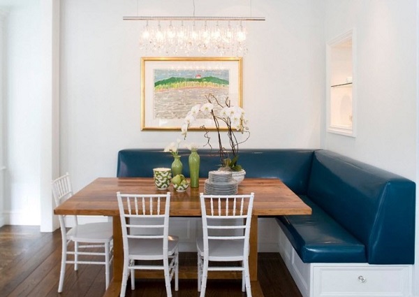 - Угловой диван. Модель, пользующая наибольшим спросом. Основными преимуществами такой мебели является компактность и функциональность. Несмотря на то, что уголки выбирают преимущественно для маленьких помещений, нередко они становятся дополнением и просторных кухонь. Угловые диваны могут иметь различную форму и вид: с подлокотниками или без, с открытыми полочками или внутренними ящиками для хранения вещей и тому подобное.