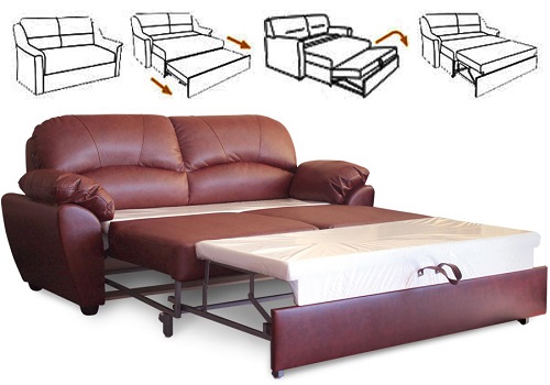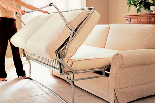 - Убрав с дивана все мягкие элементы (подушки, сиденья, покрывало), следует одновременно вытянуть раскладушку и поднять ее вверх.